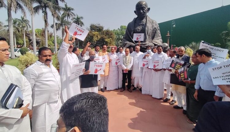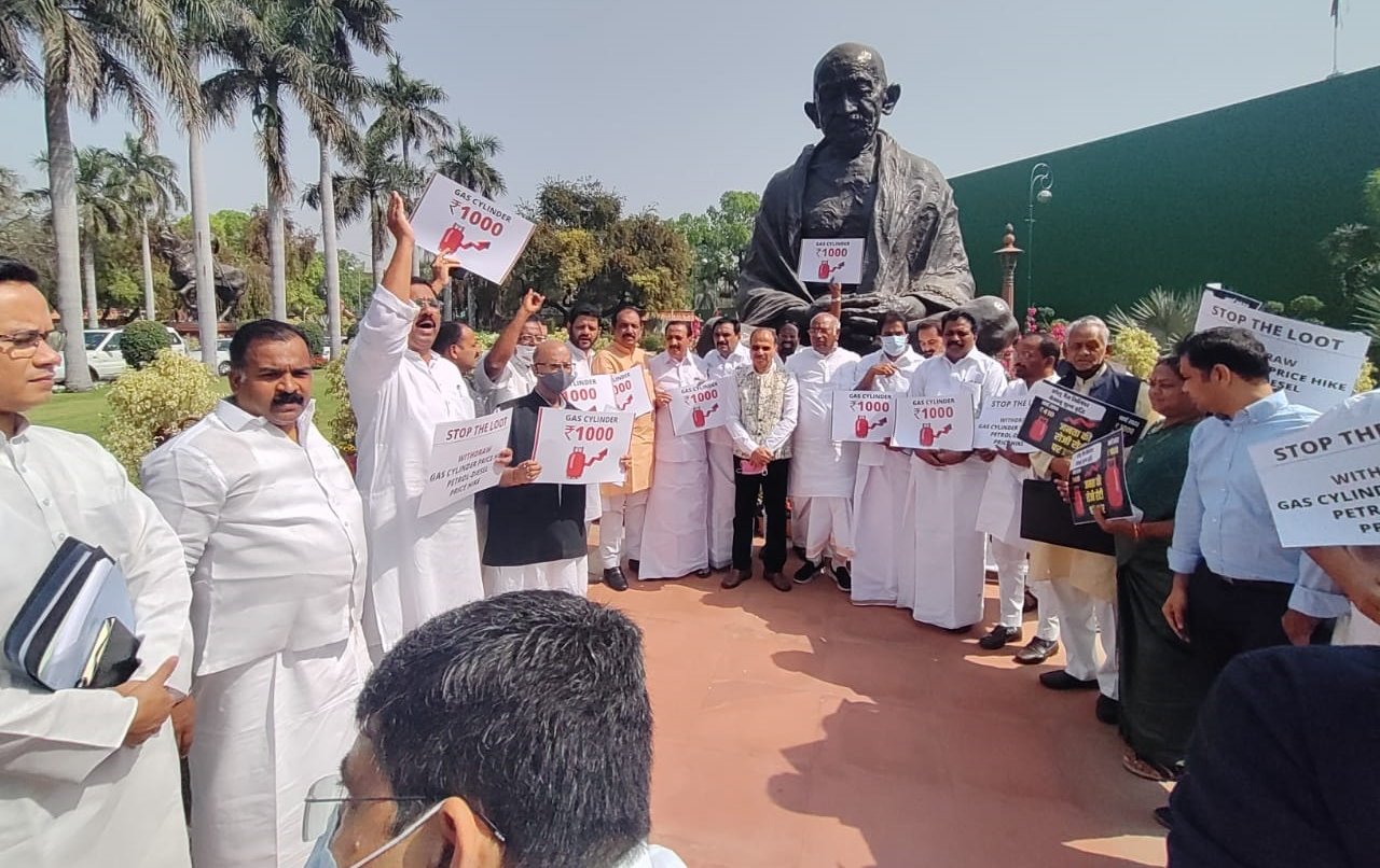 Delhi | Congress MPs protest at the Gandhi statue in Parliament, over the increase in the prices of LPG cylinder gas and petrol & diesel. Nation By Editor Last updated Mar 23, 2022 109 Share 109 Share
