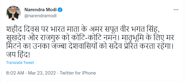 Prime Minister Narendra Modi pay tributes to Bhagat Singh, Sukhdev and Rajguru on the occasion of Shaheed Diwas