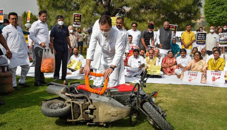 Congress leader Rahul Gandhi garlands a two-wheeler during a protest over the hike in prices of #petrol, diesel and LPG cylinders, at Vijay Chowk in New Delhi.