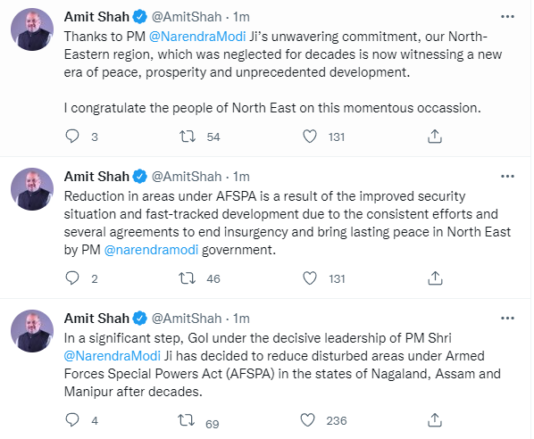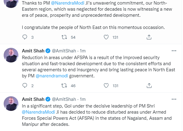 Government of India decides to reduce disturbed areas under Armed Forces Special Powers Act (AFSPA) in the states of Nagaland, Assam and Manipur after decades: Union Home Minister Amit Shah Nation By Editor Last updated Mar 31, 2022 270 Share 270 Share