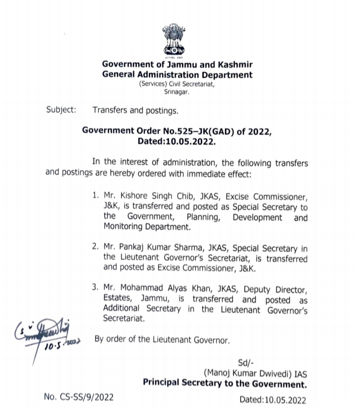J&K Govt orders transfer and posting of Three JKAS Officer’s.
