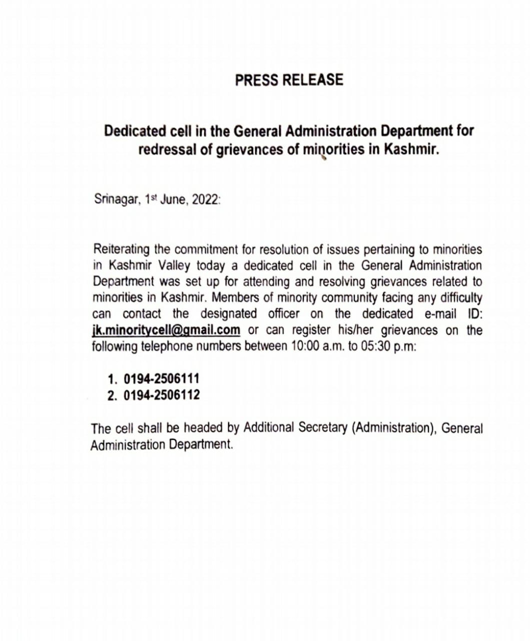 Jammu and Kashmir : The detailed communication regarding the setting up of dedicated cell in the GAD for redressal of grievances of minorities in Kashmir. Members of the minority community facing any difficulty can contact the cell at the below mentioned email id & phone numbers.