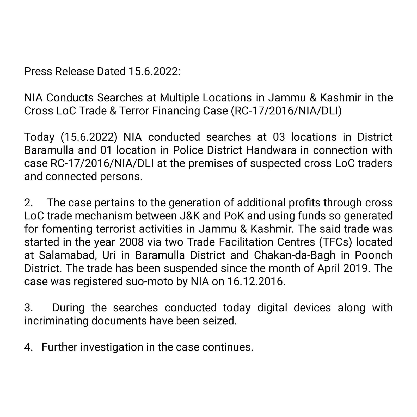 J&K | NIA Conducts Searches at Multiple Locations in Jammu & Kashmir in the Cross LoC Trade & Terror Financing Case. J&K / Ladakh By Editor Last updated Jun 15, 2022 141 Share 141 Share