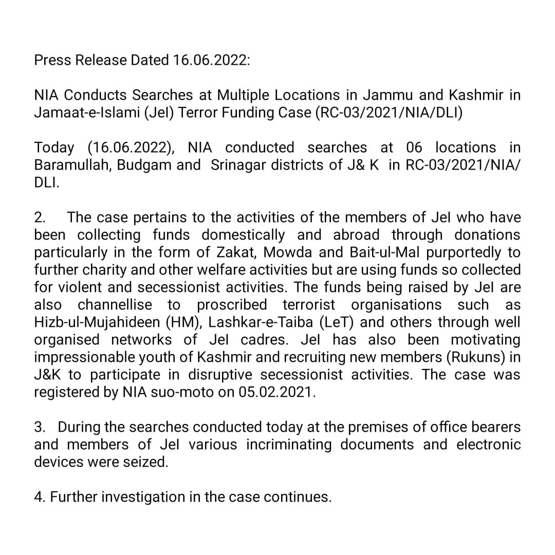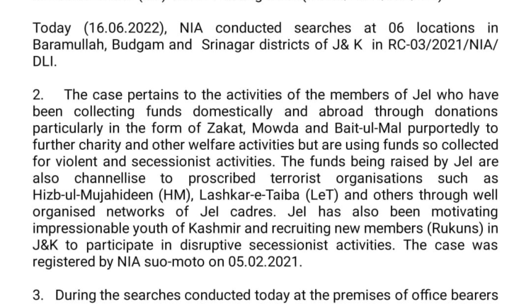 NIA Conducts Searches at Multiple Locations in Jammu and Kashmir in Jamaat-e-Islami (JEI) Terror Funding Case J&K / Ladakh By Editor Last updated Jun 16, 2022 135 Share 135 Share