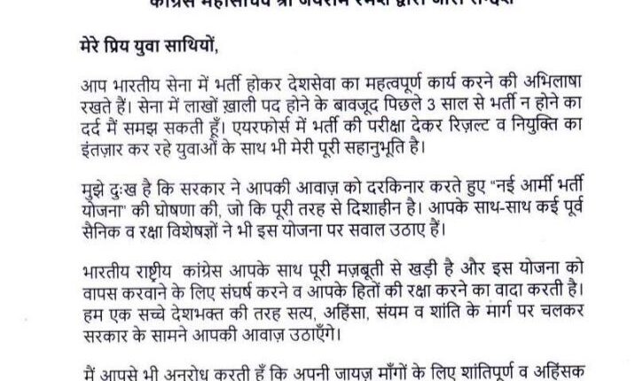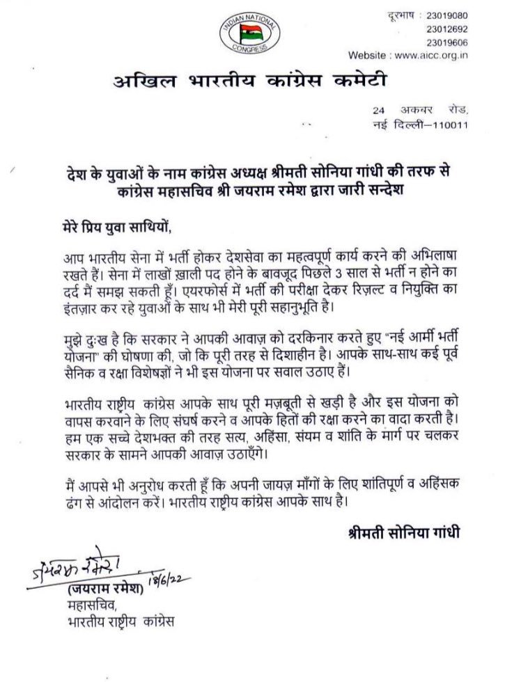 I’m sad that govt ignored your voice & announced a new scheme that is completely directionless… I appeal to all of you to protest peacefully in a non-violent manner. Indian National Congress is with you: Congress chief Sonia Gandhi on #AgnipathRecruitmentScheme