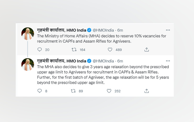 The MHA also decides to give 3 years age relaxation beyond the prescribed upper age limit to Agniveers for recruitment in CAPFs & Assam Rifles. Further, for the first batch of Agniveer, the age relaxation will be for 5 years beyond the prescribed upper age limit.