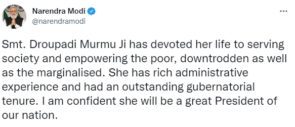 PM Modi affirms, “I am confident she will be a great President,” on Draupadi Murmu as BJP’s choice for Presidential candidate