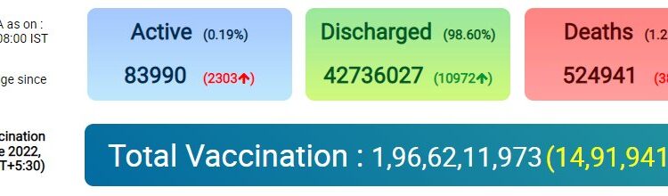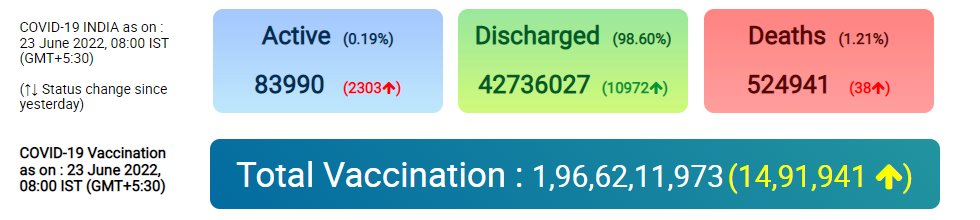 COVID19 | India reports 13,313 fresh cases, 10,972 recoveries and 38 deaths in the last 24 hours. Nation By Editor Last updated Jun 23, 2022 123 Share Active cases 83,990Daily positivity rate 2.03% 123 Share