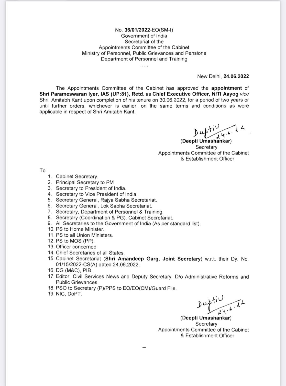 Parameswaran Iyer, lAS (UP:81), Retd, appointed as CEO, NITI Aayog for a period of two years. He succeeds Amitabh Kant who is completing his tenure on 30.06.2022 Nation By Editor Last updated Jun 24, 2022 180 Share 180 Share