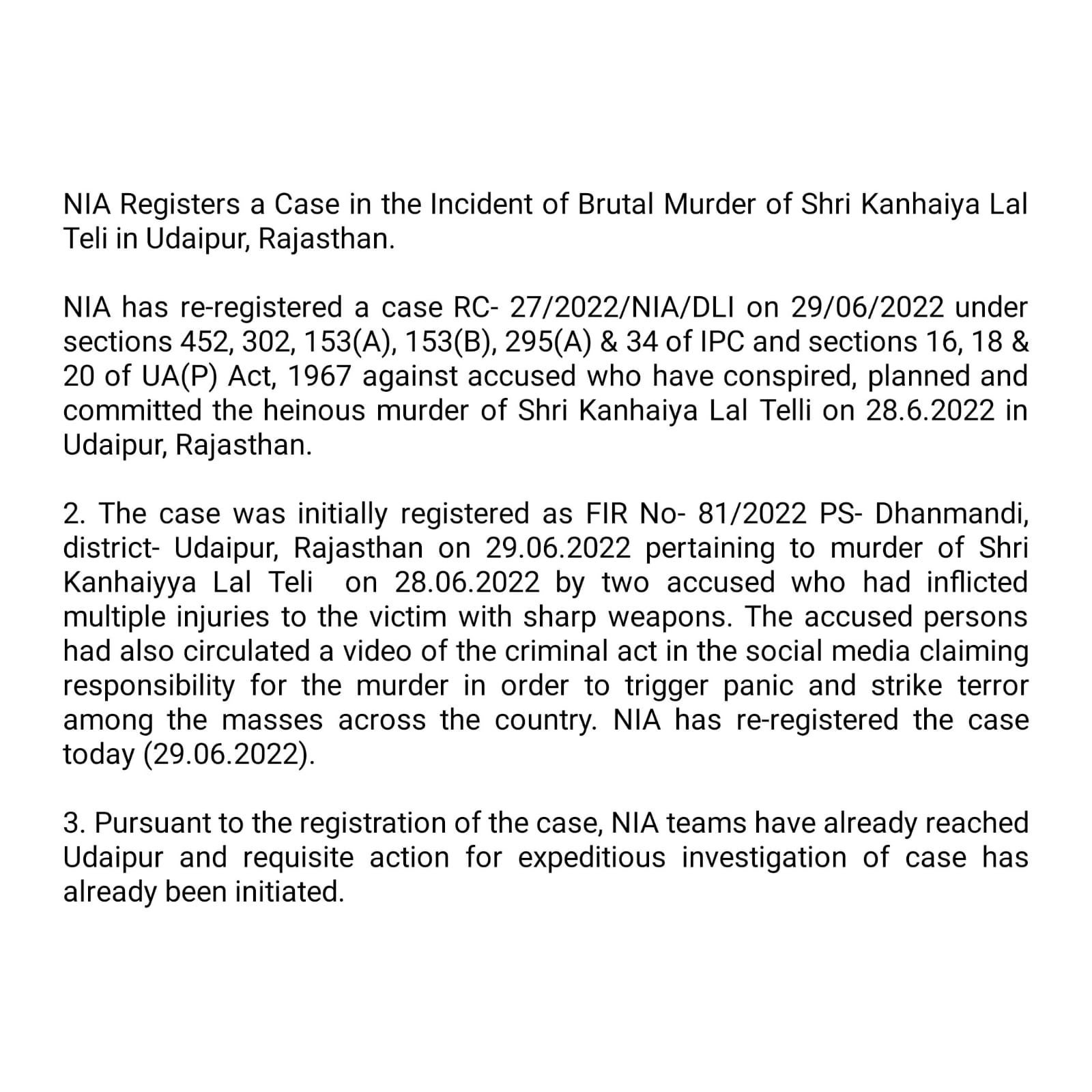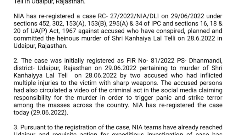 NIA registers a case in incident of murder of Kanhaiya Lal Teli in Udaipur, Rajasthan. Pursuant to registration of the case, NIA teams have already reached Udaipur & requisite action for expeditious investigation of case has already been initiated: National Investigation Agency