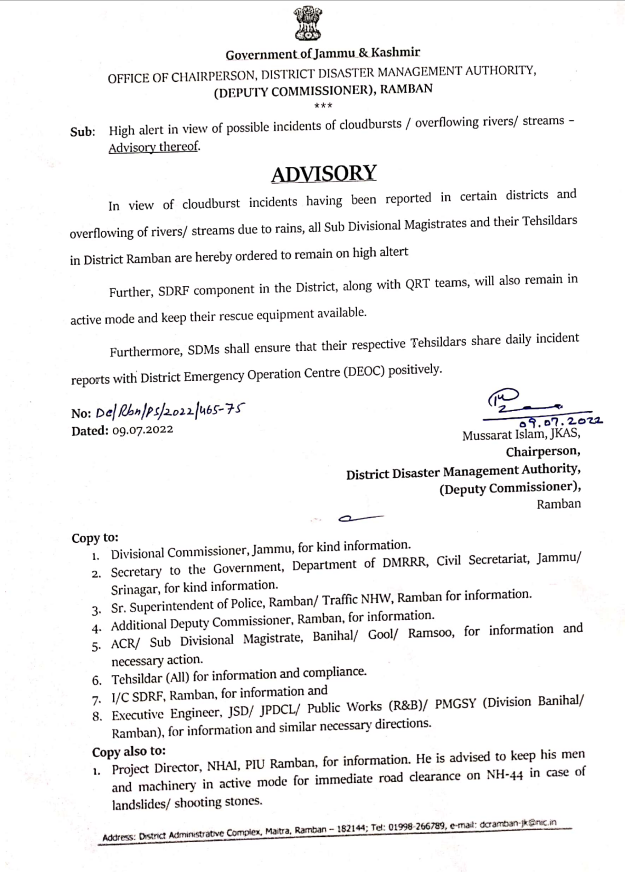 J&K | Advisory issued for possible cloudbursts/ overflowing of rivers/ streams in Ramban District