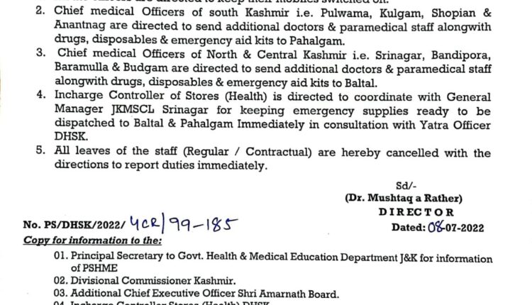 J&K | Directorate of Health Services, Kashmir cancelled all leaves of the staff (Regular/Contractual) and directed them to report to duties immediately. All the officers directed to keep their mobiles switched on. J&K / Ladakh By Editor Last updated Jul 9, 2022 164 Share 164 Share