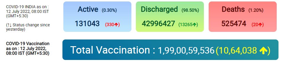 COVID19 | India reports 13,615 fresh cases, 13,265 recoveries and 20 deaths in the last 24 hours. Nation By Editor Last updated Jul 12, 2022 122 Share Active cases 1,31,043Daily positivity rate 3.23% 122 Share