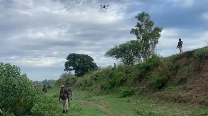 Jammu & Kashmir | Security forces deploy a drone to conduct a search operation after villagers from Mangu Chak village of Samba informed police about spotting a drone in the area