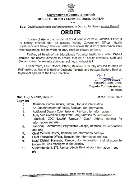 Jammu and Kashmir | Ramban,Bandipora, Ganderbal & Srinagar Administration make Face masks mandatory in public places. J&K / Ladakh By Editor Last updated Jul 19, 2022 172 Share 172 Share