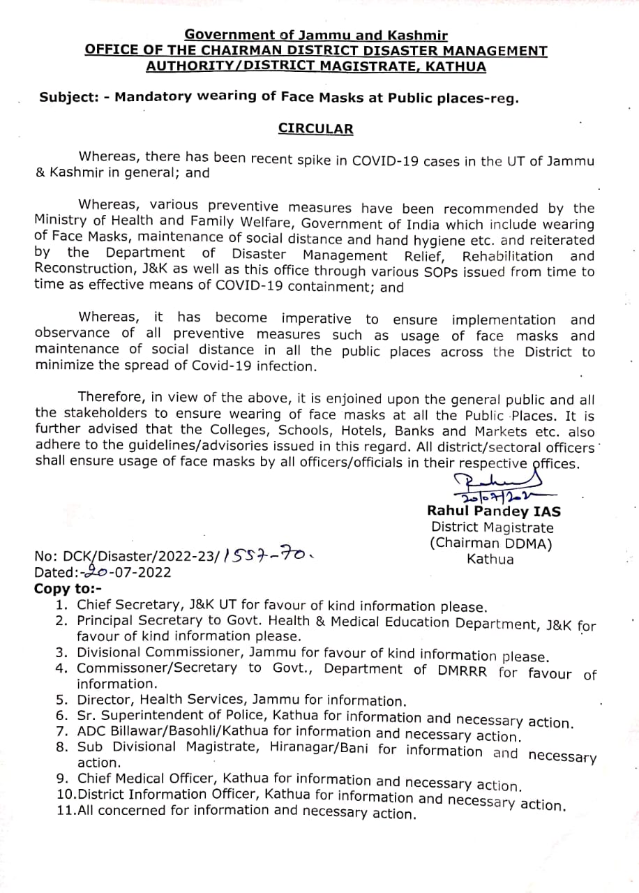 In view of recent spike in #COVID19 cases in UT of Jammu & Kashmir, DC #Kathua issues order wherein use of face #Mask has been made mandatory for people visiting public places. J&K / Ladakh By Editor Last updated Jul 20, 2022 155 Share 155 Share