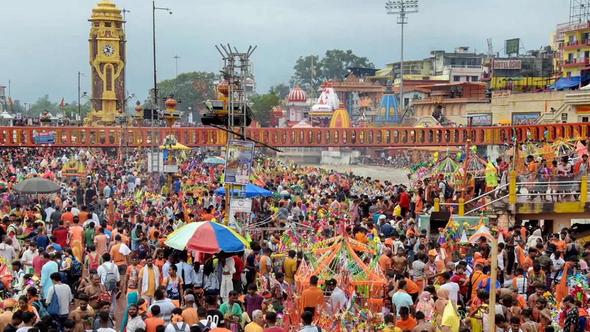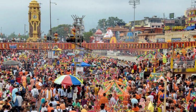 Kanwariyas (Lord Shiva devotees) at the Har Ki Pauri ghat to collect water from the Ganga river during the holy month of ‘Shravan’, in Haridwar.