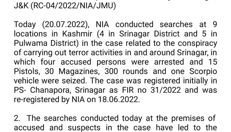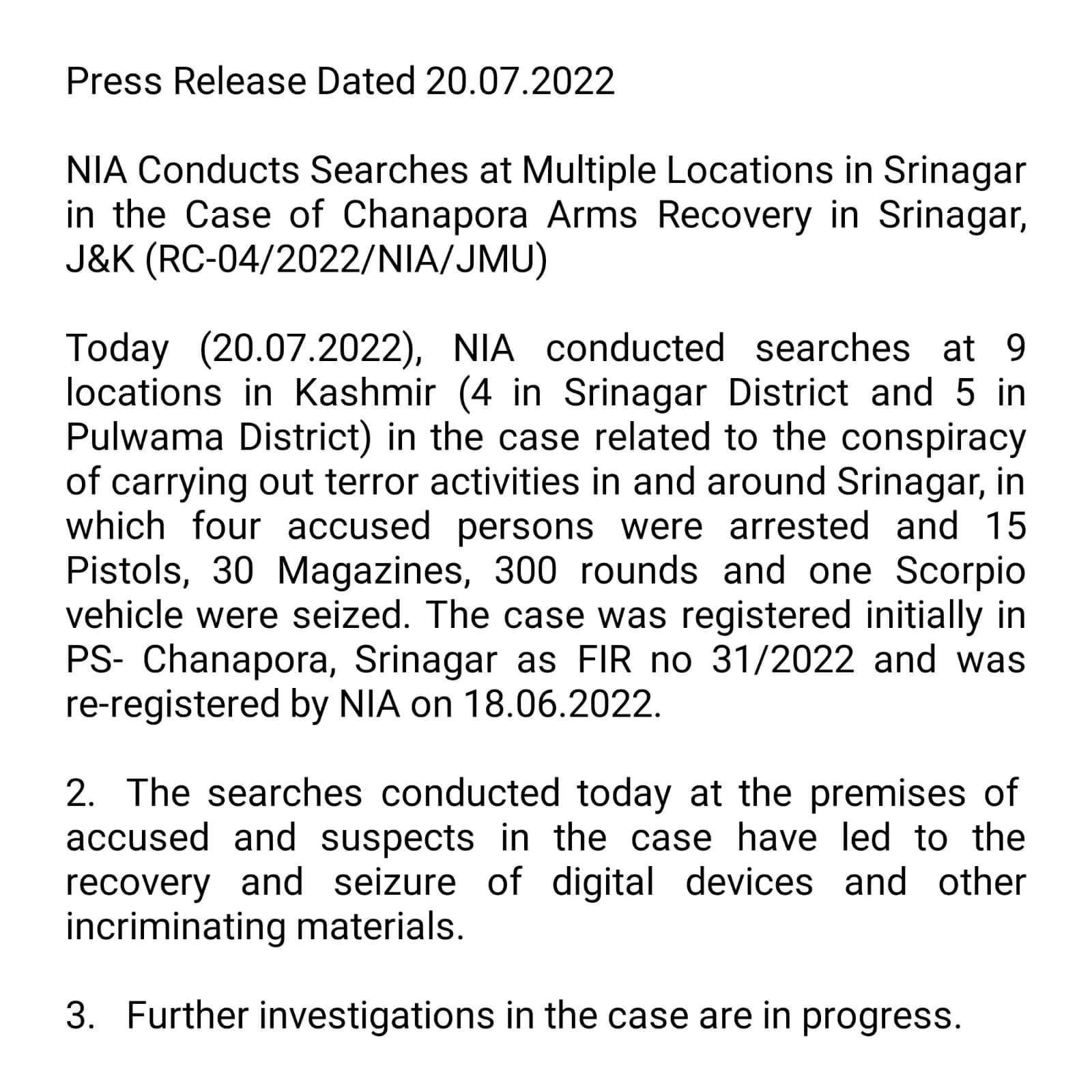 Jammu and Kashmir | NIA Conducts Searches at Multiple Locations in Srinagar in the Case of Chanapora Arms Recovery in Srinagar, J&K (RC-04/2022/NIA/JMU) J&K / Ladakh By Editor Last updated Jul 21, 2022 303 Share 303 Share