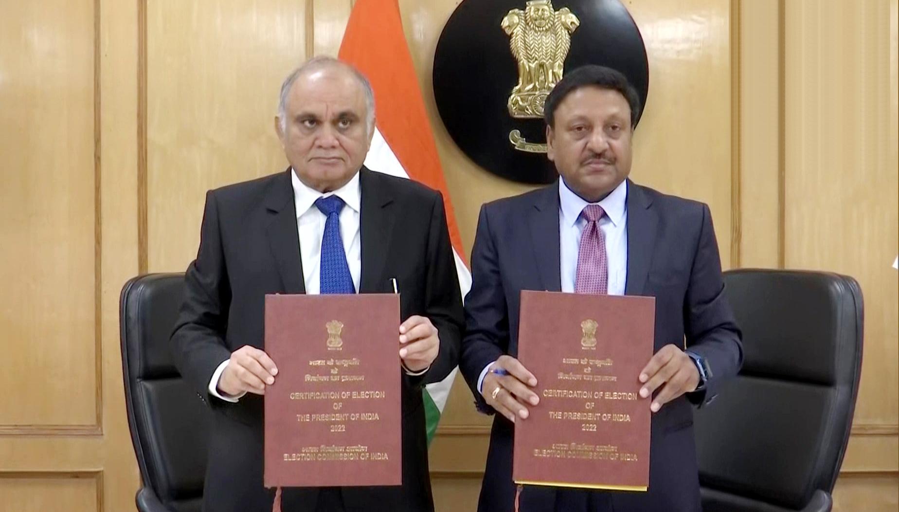 Delhi | Chief Election Commissioner Rajiv Kumar & Election Commissioner Anup Chandra Pandey jointly signed ‘Certification of Election of Droupadi Murmu as next President of India’ after ECI received Return of Election & a Declaration of Result of election from Returning Officer.