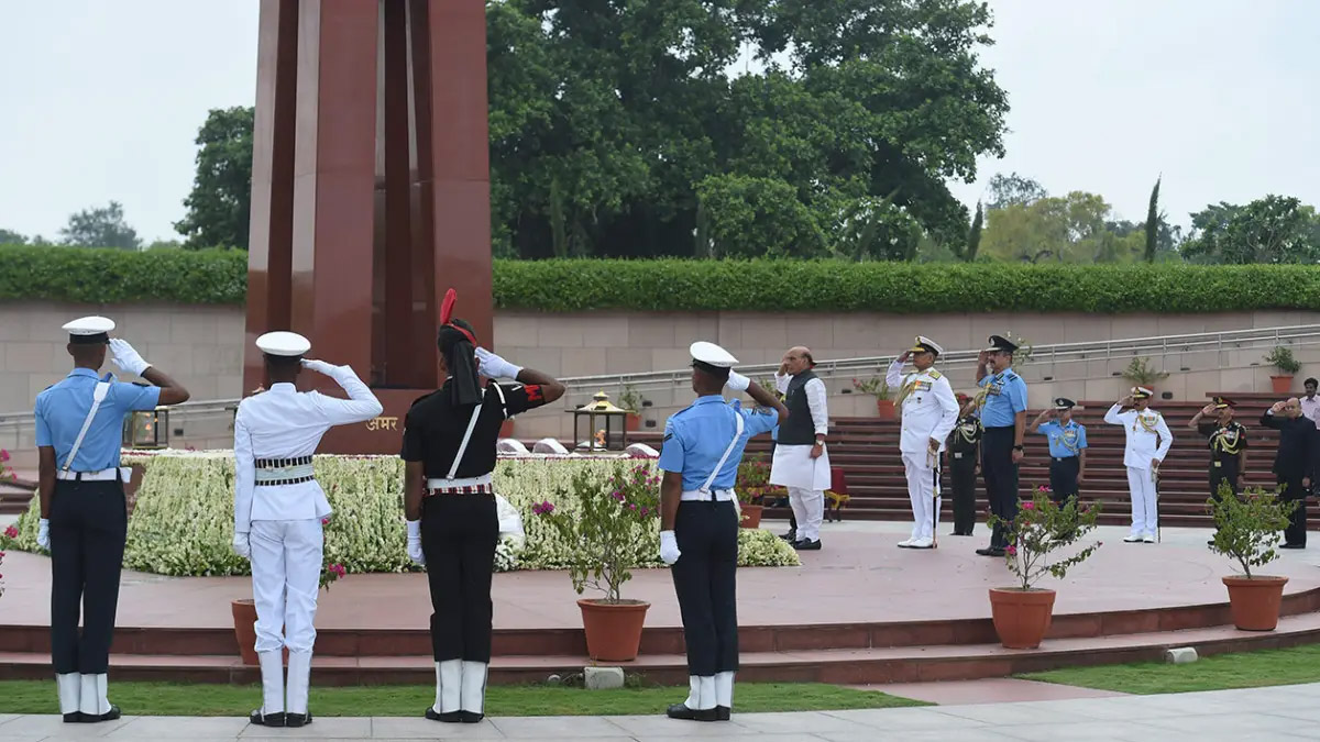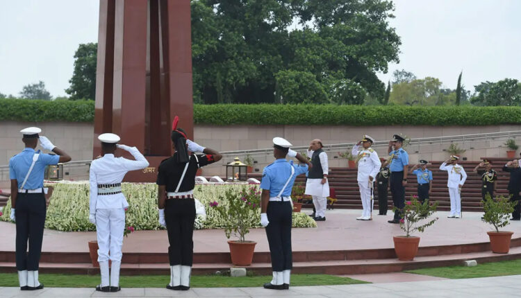 Union Defence Minister Rajnath Singh with Army Chief General Manoj Pande, IAF Chief Air Chief Marshal VR Chaudhari and Navy Chief Admiral R Hari Kumar pays homage at the National War Memorial on the occasion of Kargil Vijay Diwas, in New Delhi. Nation By Editor Last updated Jul 26, 2022 326 Share 326 Share