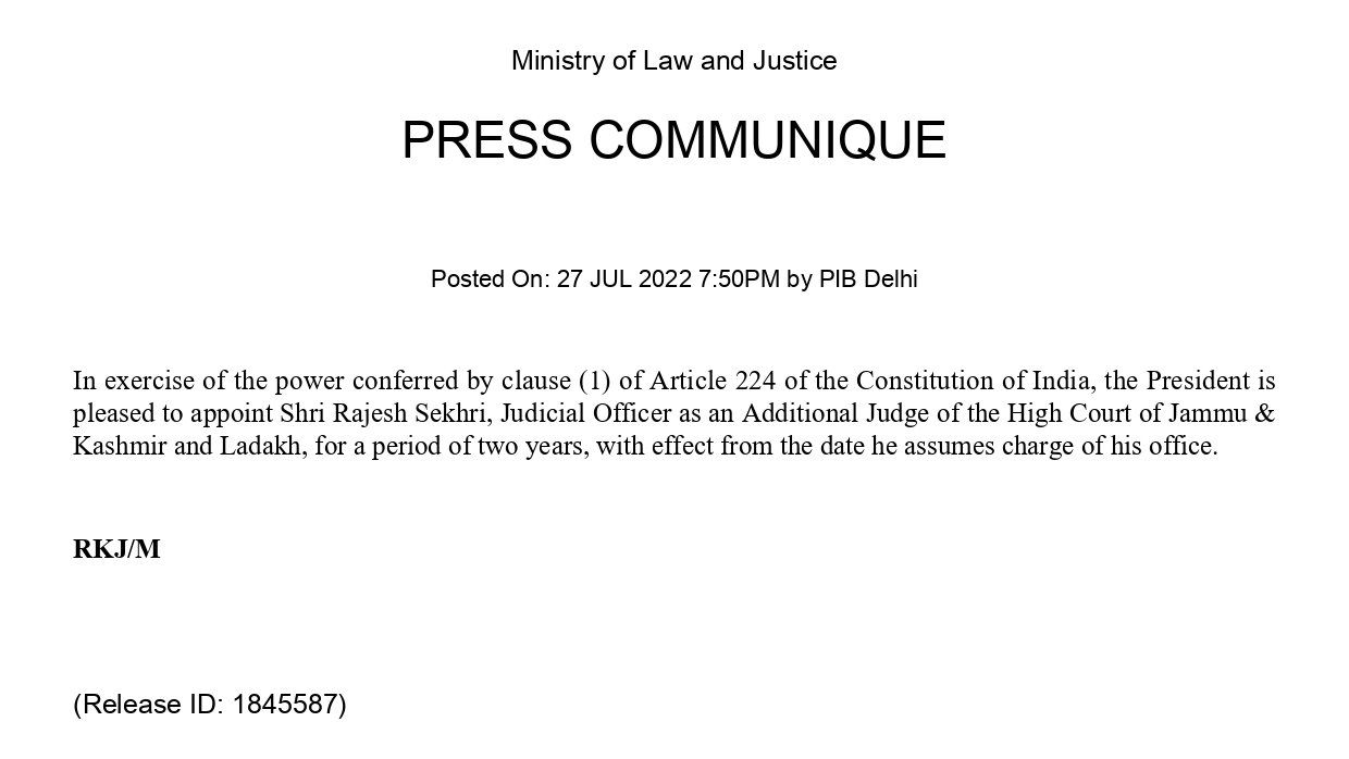 In exercise of the power conferred by the Constitution of India, the President appointed Rajesh Sekhri, Judicial Officer as an Additional Judge of the High Court of Jammu & Kashmir and Ladakh