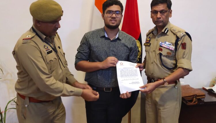 Jammu and Kashmir | ADGP Jammu Mukesh Singh felicitates Sushant Kumar Chakharia son of Police ASI Subhash Chander and student of Jammu Sanskriti School who scored 99.6% marks in Class XII examination.