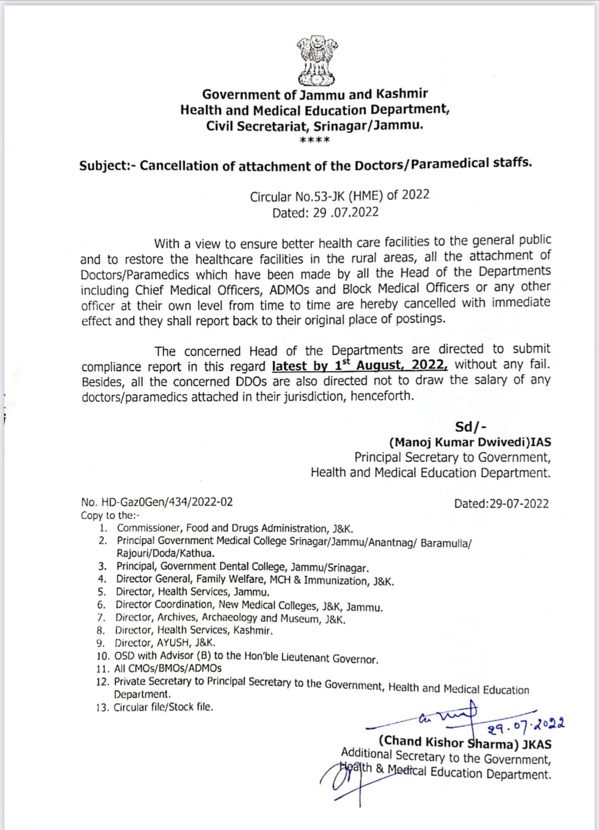 The attachment of Doctors/Paramedics which have been made by all the HoD including Chief Medical Officers, ADMOs and BMO or any other officer at their own level from time to time are hereby cancelled with immediate effect&they shall report back to their original place of postings