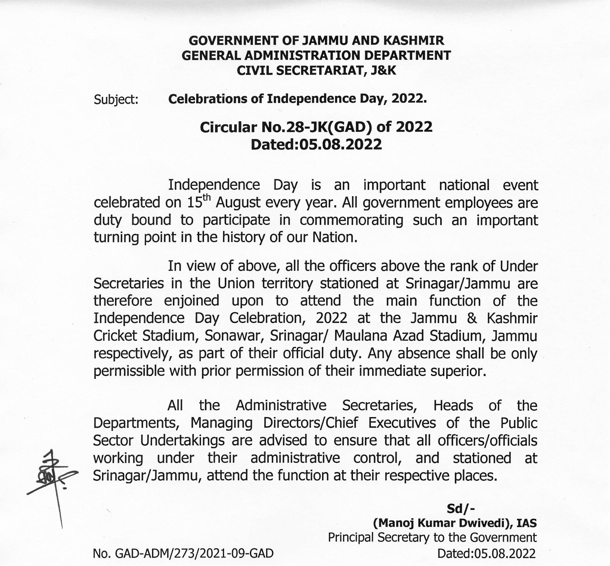 The J&K Govt asked all the officers above the rank of Under Secretaries in J&K stationed at Srinagar and Jammu to attend the main function of 15 August Celebration at the J&K Cricket Stadium Sonawar in Srinagar and MA Stadium in Jammu, respectively as part of their official duty.