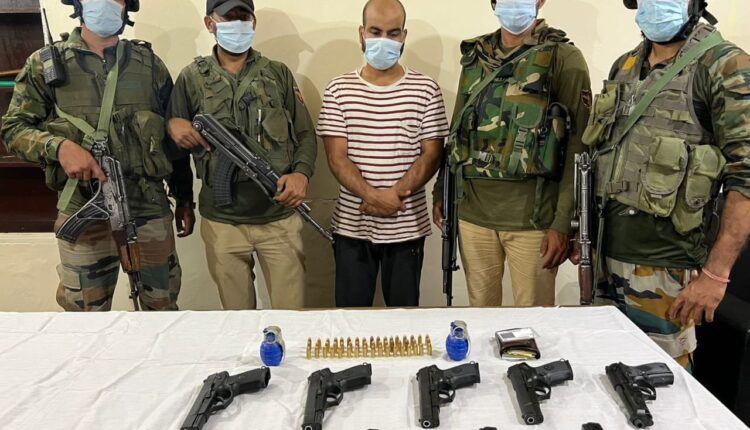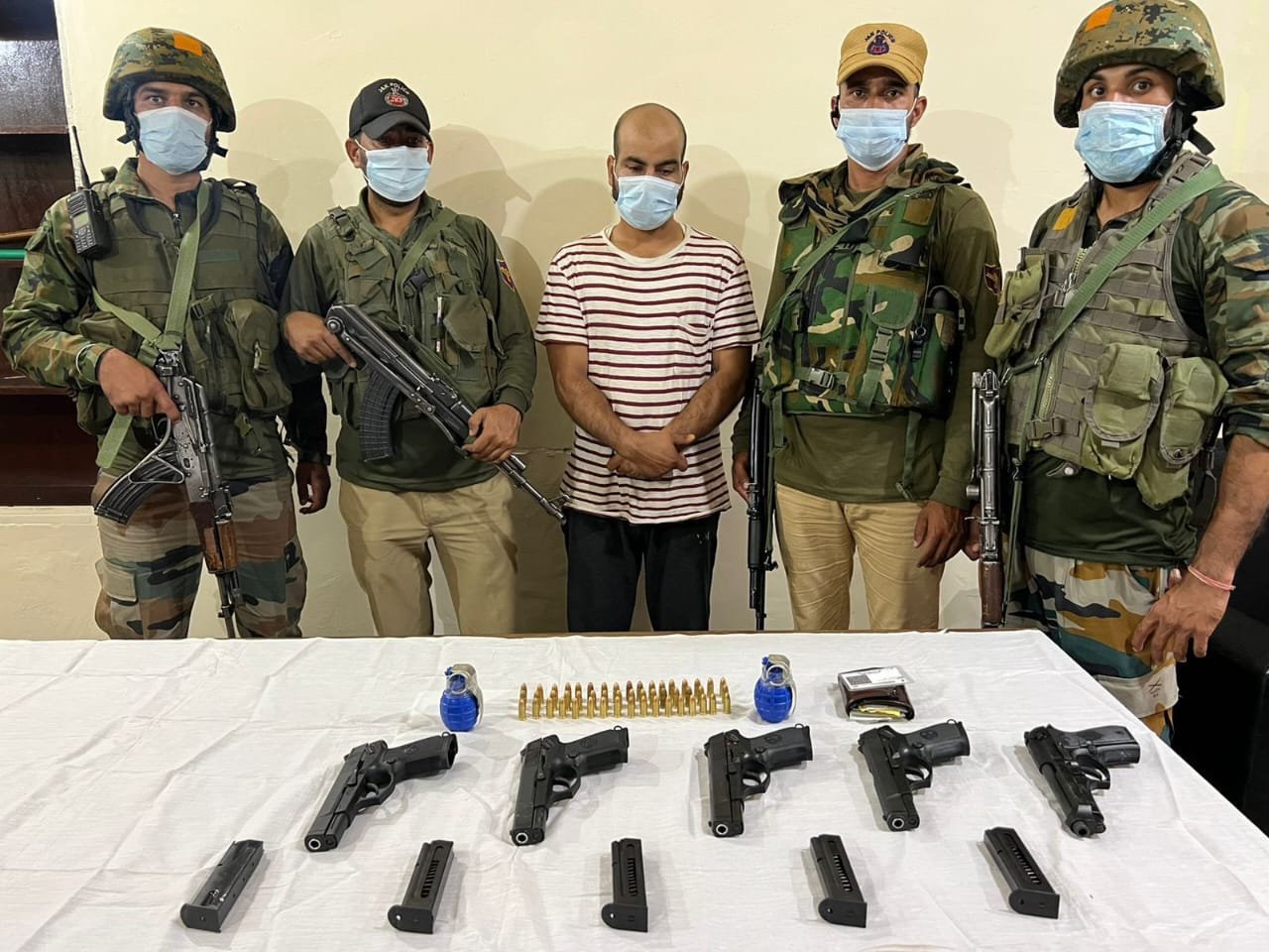 J&K | On specific info, a Hybrid terrorist of LeT namely Arshid Ahmad Bhat, resident of Sangam Budgam arrested by a joint team of Srinagar Police & 2RR at Lawaypura. 5 pistols, 5 magazines, 50 rounds & 2 hand grenades recovered. Case registered at Shalteng PS: Srinagar Police
