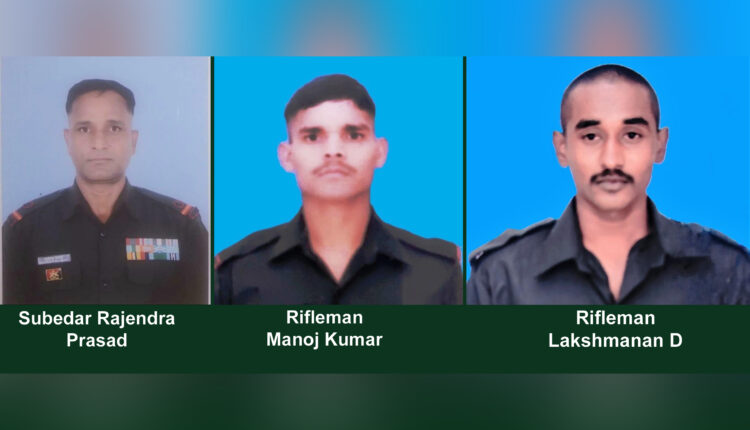 RAJOURI (J&K) | Subedar Rajendra Prasad, Rifleman Manoj Kumar and Rifleman Lakshmanan D lost their lives while neutralising two terrorists who carried out a suicide attack on an Army company operating base 25 km from Rajouri. J&K / Ladakh By Editor Last updated Aug 11, 2022 538 Share 538 Share