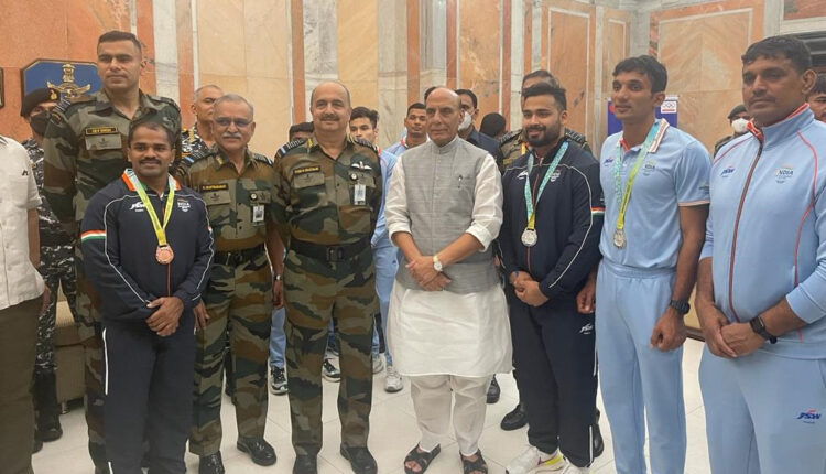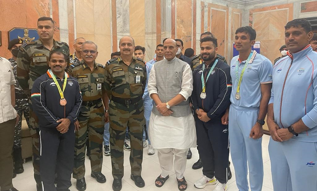 Defence Minister Rajnath Singh along with Air Chief Marshal VR Chaudhari today felicitated sportspersons from the three Armed Forces who participated in the #CommonwealthGames2022
