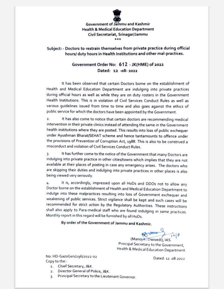 J&K Govt on Friday asked doctors and paramedical staff to restrain from private practice during duty hours in Health Institutions and warned of “strict action” in case of any violation. J&K / Ladakh By Editor Last updated Aug 12, 2022 282 Share 282 Share