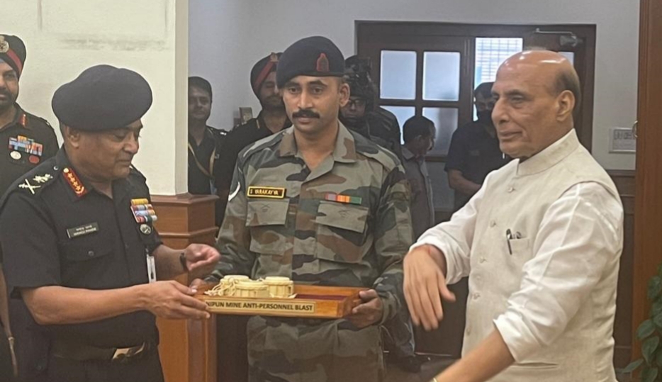 Delhi | Anti-personnel mine Nipun handed over to the Indian Army, by Defence Minister Rajnath Singh today. Around 7 lakh of these mines would be provided to the force manufactured by Indian private sector industry