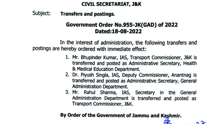 • Jammu and Kashmir Government Transferred Three IAS officers
