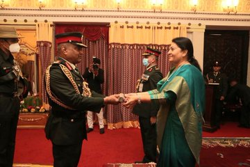 President of Nepal Bidhya Devi Bhandari confers the Honorary Rank of General of Nepali Army on COAS General Manoj Pande at Sheetal Niwas in Nepal, as per the unique tradition between the two Armies: Indian Army World By Editor Last updated Sep 5, 2022 198 Share 198 Share