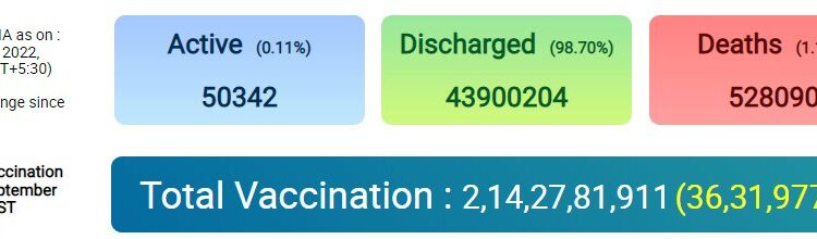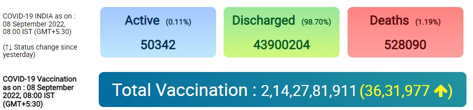 #COVID19 | India reports 6,395 fresh cases and 6,614 recoveries, in the last 24 hours. Nation By Editor Last updated Sep 8, 2022 151 Share Active cases 50,342Daily positivity rate 1.96% 151 Share