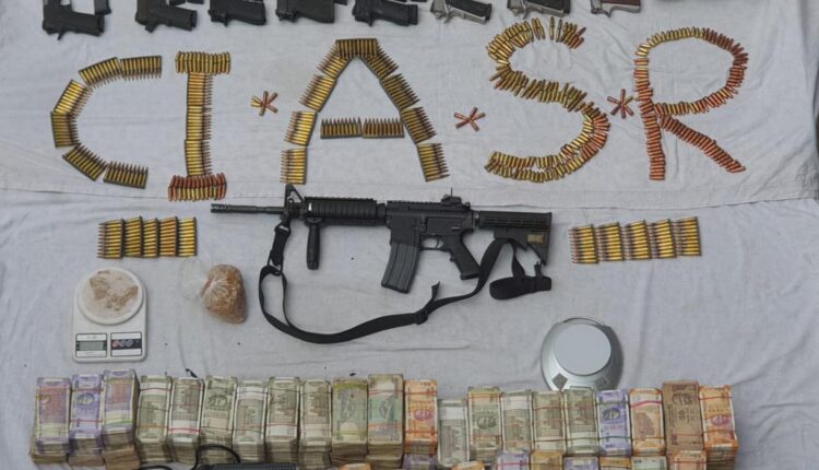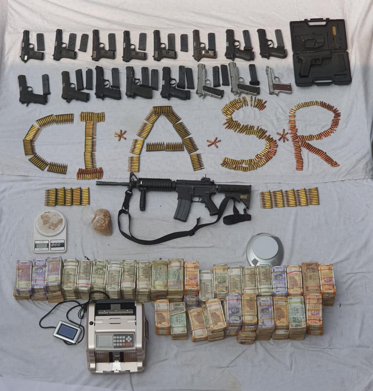 Recovered: 1 MP-4 Rifle, 17 Pistols, 10 Magazines, 700+ ammunition rounds, Rs. 1.1 Crore INR and 500 Grams