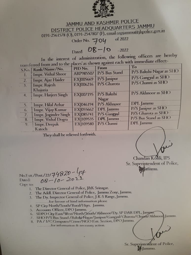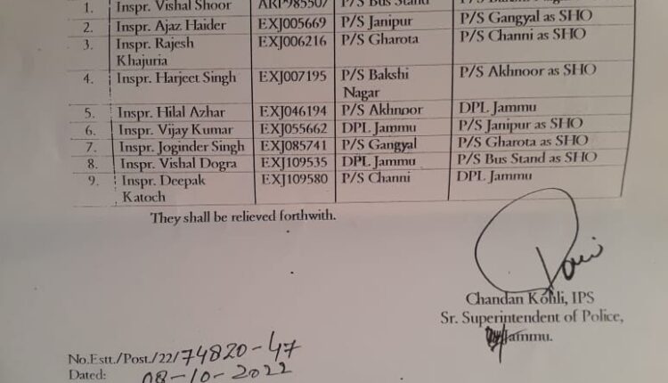 Jammu and Kashmir | SSP Jammu Chandan Kohli orders transfers and postings of 9 SHOs J&K / Ladakh By Editor Last updated Oct 8, 2022 282 Share 282 Share