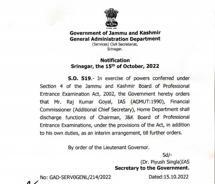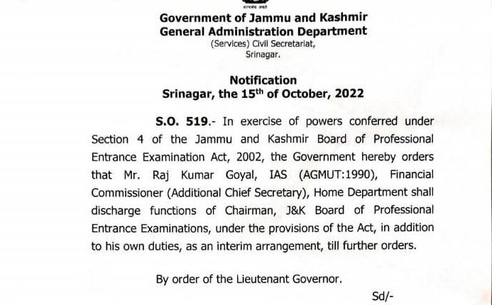 J&K | Appointment of interim Chairman of the Jammu and Kashmir Board of Professional Entrance Examinations