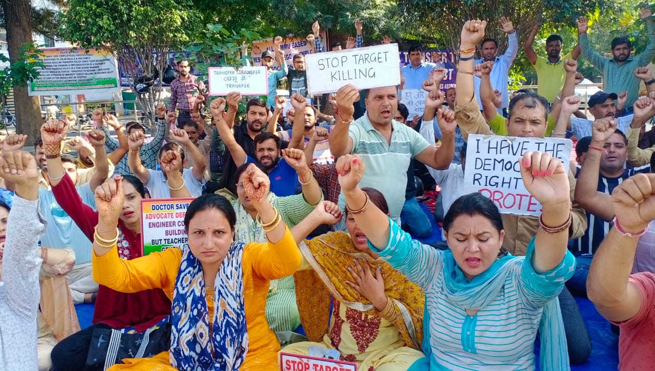 J&K | Migrant Kashmiri Pandit employees in Jammu protest against the killing of one Puran Krishan Bhat by terrorists in Shopian