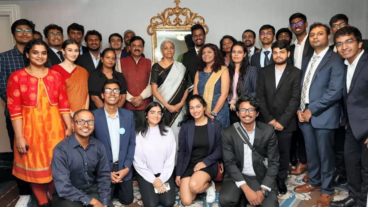 Union Finance Minister Nirmala Sitharaman during her interaction with a group of Indian-overseas scholars & students from various US universities; University of Maryland, Harvard University, American University, Georgetown University & Princeton University, in Washington DC, USA.