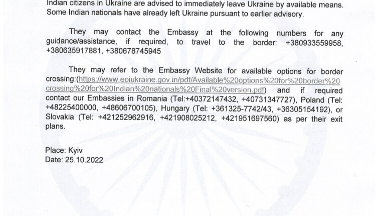In continuation of the advisory issued by the Embassy on 19th Oct, all Indian citizens in Ukraine are advised to immediately leave Ukraine by available means. Some Indian nationals have already left Ukraine pursuant to earlier advisory: Embassy of India in Kyiv (Ukraine)