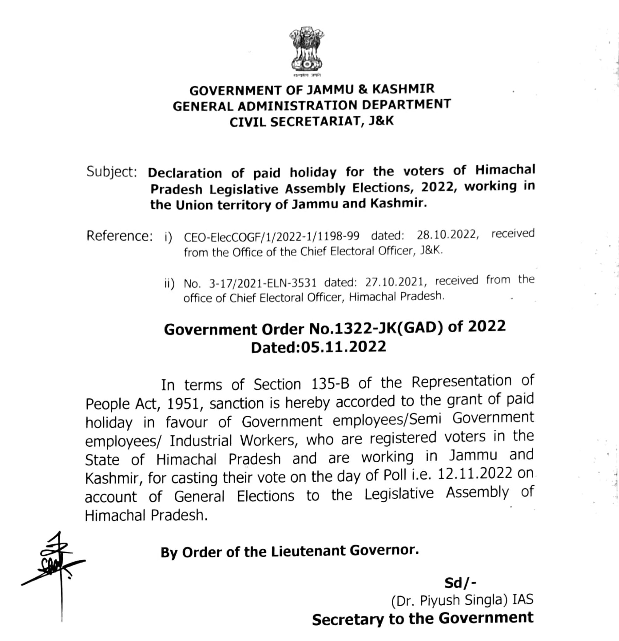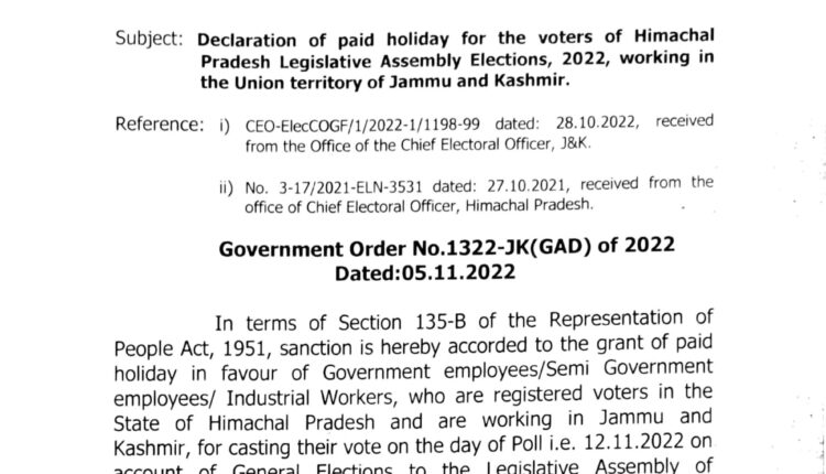J&K | Declaration of paid holiday for the voters of Himachal Pradesh Legislative Assembly Elections 2022 working in the Union territory of Jammu and Kashmir J&K / Ladakh By Editor Last updated Nov 5, 2022 186 Share 186 Share