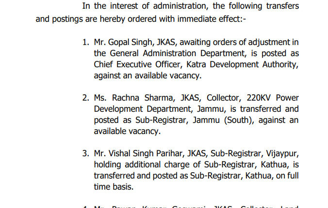 Ms. Rachna Sharma, JKAS, Collector, 220KV Power Development Department, Jammu, has been transferred and posted as Sub-Registrar, Jammu (South), against an available vacancy.