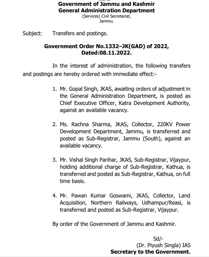 Pawan Kumar Goswami, JKAS, Collector, Land Acquisition, Northern Railways, Udhampur/Reasi, has been transferred and posted as Sub-Registrar, Vijaypur
