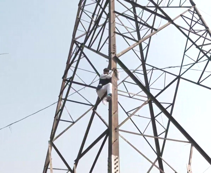 Delhi | Former AAP Councillor Haseeb-ul-Hasan climbs a transmission tower near Shastri Park Metro Station allegedly unhappy over not being given ticket for upcoming MCD poll.
