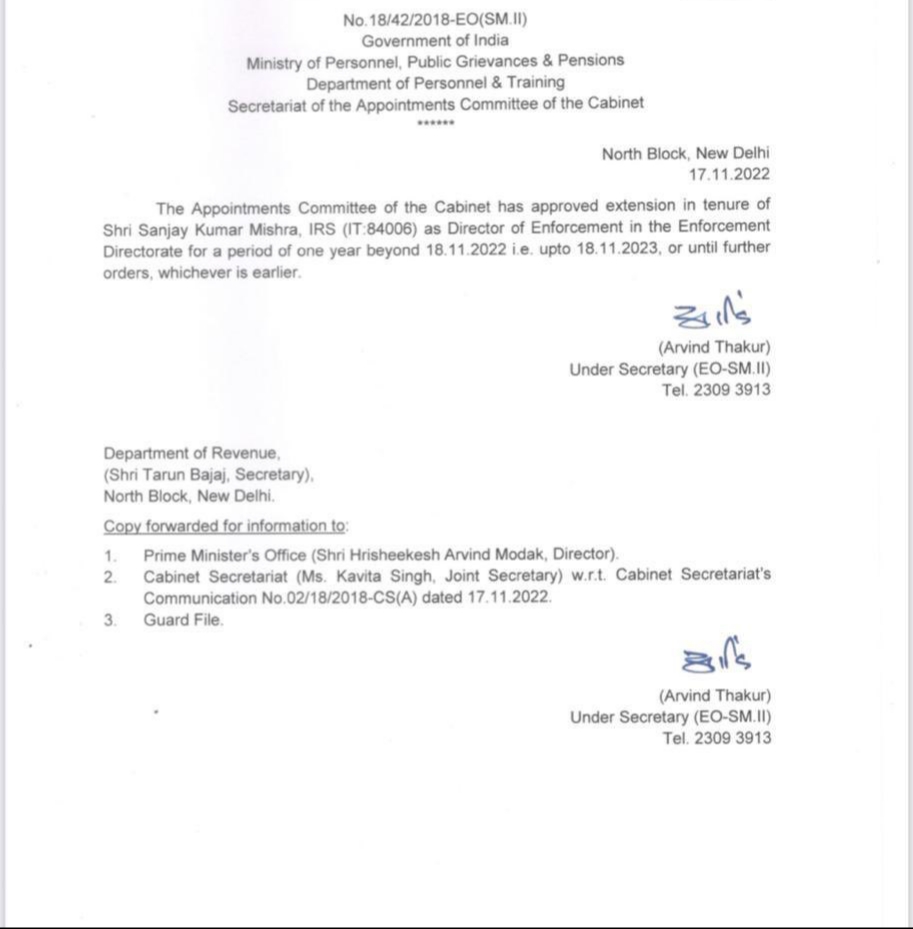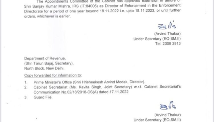 The appointments Committee of the cabinet has approved an extension in the tenure of Sanjay Kumar Mishra, as Director of Enforcement in the Enforcement Directorate (ED) for a period of one year. Nation By Editor Last updated Nov 17, 2022 361 Share 361 Share
