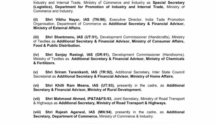 Khilli Ram Meena has been appointed as Additional Secretary & Financial Advisor, Ministry of Rural Development, Mahmood Ahmed will be Additional Secretary, Ministry of Road Transport & Highways and Rajesh Agarwal has been appointed as Additional Secretary, Department of Commerce, the order stated.