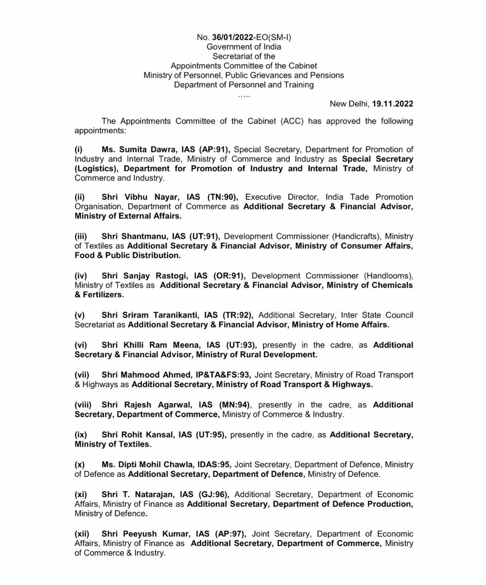 Besides him, Sumita Dawra has been appointed as Special Secretary (Logistics), Department for Promotion of Industry and Internal Trade, an order issued by the Personnel Ministry said.