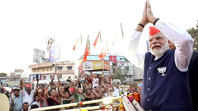 Ahmedabad-: Prime Minister Narendra Modi greets during a roadshow for the Gujarat Assembly elections, at Karnavati, in Ahmedabad